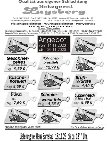 Deprecated: Die Funktion WP_Dependencies->add_data() wurde mit einem Argument aufgerufen, das seit Version 6.9.0 veraltet ist! Conditional Comments für den Internet Explorer werden von allen unterstützten Browsern ignoriert. in /var/www/vhosts/metzgerei-luysberg.de/httpdocs/wp-includes/functions.php on line 6131 Angebot vom 14.11.-20.11.23 – Metzgerei LuysbergZum Inhalt springen