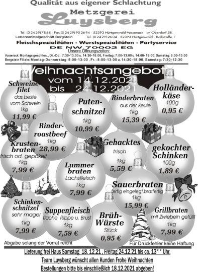 Deprecated: Die Funktion WP_Dependencies->add_data() wurde mit einem Argument aufgerufen, das seit Version 6.9.0 veraltet ist! Conditional Comments für den Internet Explorer werden von allen unterstützten Browsern ignoriert. in /var/www/vhosts/metzgerei-luysberg.de/httpdocs/wp-includes/functions.php on line 6131 Angebot vom 14.12.-24.12.2021 – Metzgerei LuysbergZum Inhalt springen