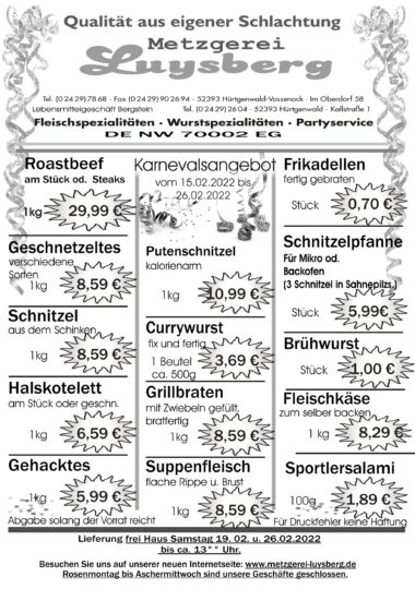 Deprecated: Die Funktion WP_Dependencies->add_data() wurde mit einem Argument aufgerufen, das seit Version 6.9.0 veraltet ist! Conditional Comments für den Internet Explorer werden von allen unterstützten Browsern ignoriert. in /var/www/vhosts/metzgerei-luysberg.de/httpdocs/wp-includes/functions.php on line 6131 Angebot vom 15.02.-26.02.22 – Metzgerei LuysbergZum Inhalt springen