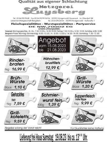 Deprecated: Die Funktion WP_Dependencies->add_data() wurde mit einem Argument aufgerufen, das seit Version 6.9.0 veraltet ist! Conditional Comments für den Internet Explorer werden von allen unterstützten Browsern ignoriert. in /var/www/vhosts/metzgerei-luysberg.de/httpdocs/wp-includes/functions.php on line 6131 Angebot vom 15.08.-21.08.23 – Metzgerei LuysbergZum Inhalt springen