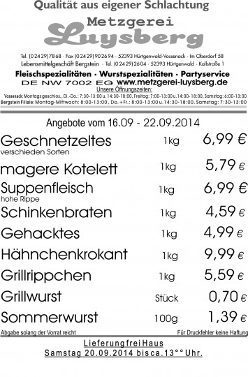 Deprecated: Die Funktion WP_Dependencies->add_data() wurde mit einem Argument aufgerufen, das seit Version 6.9.0 veraltet ist! Conditional Comments für den Internet Explorer werden von allen unterstützten Browsern ignoriert. in /var/www/vhosts/metzgerei-luysberg.de/httpdocs/wp-includes/functions.php on line 6131 Angebot vom 16.09-22.09.14 – Metzgerei LuysbergZum Inhalt springen