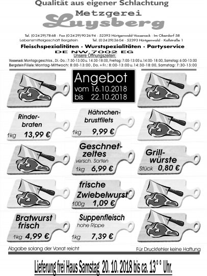 Deprecated: Die Funktion WP_Dependencies->add_data() wurde mit einem Argument aufgerufen, das seit Version 6.9.0 veraltet ist! Conditional Comments für den Internet Explorer werden von allen unterstützten Browsern ignoriert. in /var/www/vhosts/metzgerei-luysberg.de/httpdocs/wp-includes/functions.php on line 6131 Angebot vom 16.10.-22.10.2018 – Metzgerei LuysbergZum Inhalt springen