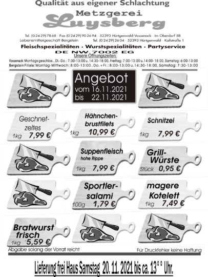 Deprecated: Die Funktion WP_Dependencies->add_data() wurde mit einem Argument aufgerufen, das seit Version 6.9.0 veraltet ist! Conditional Comments für den Internet Explorer werden von allen unterstützten Browsern ignoriert. in /var/www/vhosts/metzgerei-luysberg.de/httpdocs/wp-includes/functions.php on line 6131 Angebot vom 16.11.-22.11.21 – Metzgerei LuysbergZum Inhalt springen