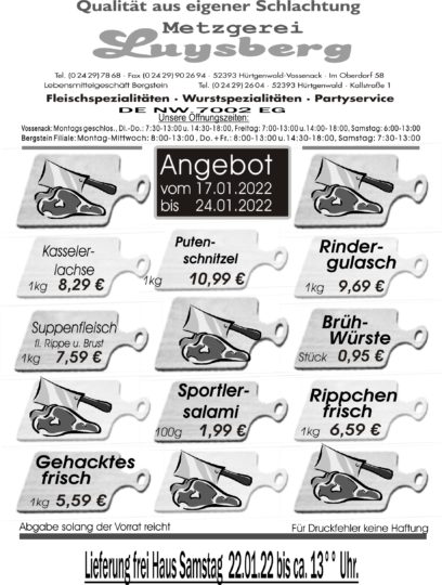 Deprecated: Die Funktion WP_Dependencies->add_data() wurde mit einem Argument aufgerufen, das seit Version 6.9.0 veraltet ist! Conditional Comments für den Internet Explorer werden von allen unterstützten Browsern ignoriert. in /var/www/vhosts/metzgerei-luysberg.de/httpdocs/wp-includes/functions.php on line 6131 Angebot vom 17.01 bis zum 24.01 – Metzgerei LuysbergZum Inhalt springen