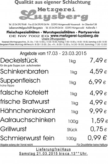 Deprecated: Die Funktion WP_Dependencies->add_data() wurde mit einem Argument aufgerufen, das seit Version 6.9.0 veraltet ist! Conditional Comments für den Internet Explorer werden von allen unterstützten Browsern ignoriert. in /var/www/vhosts/metzgerei-luysberg.de/httpdocs/wp-includes/functions.php on line 6131 Angebot vom 17.03.-23.03.15 – Metzgerei LuysbergZum Inhalt springen