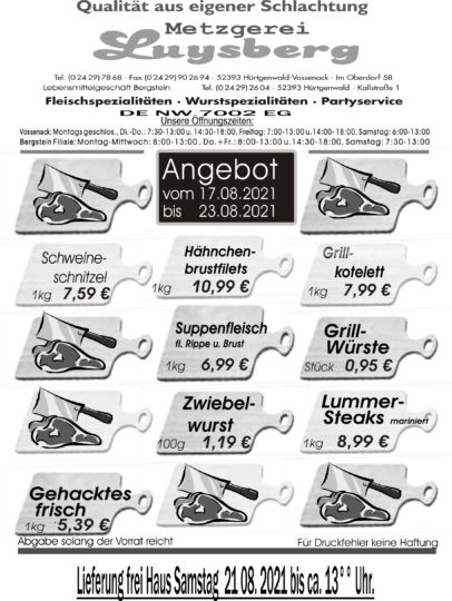 Deprecated: Die Funktion WP_Dependencies->add_data() wurde mit einem Argument aufgerufen, das seit Version 6.9.0 veraltet ist! Conditional Comments für den Internet Explorer werden von allen unterstützten Browsern ignoriert. in /var/www/vhosts/metzgerei-luysberg.de/httpdocs/wp-includes/functions.php on line 6131 Angebot vom 17.08.-23.08.21 – Metzgerei LuysbergZum Inhalt springen