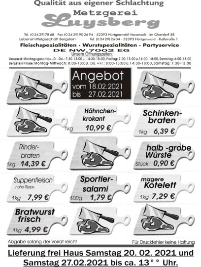 Deprecated: Die Funktion WP_Dependencies->add_data() wurde mit einem Argument aufgerufen, das seit Version 6.9.0 veraltet ist! Conditional Comments für den Internet Explorer werden von allen unterstützten Browsern ignoriert. in /var/www/vhosts/metzgerei-luysberg.de/httpdocs/wp-includes/functions.php on line 6131 Angebot vom 18.02.-27.02.21 – Metzgerei LuysbergZum Inhalt springen