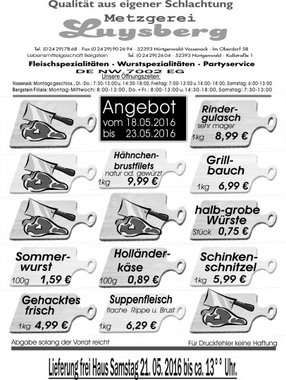 Angebot vom 18.05.-23.05.16 – Metzgerei Luysberg