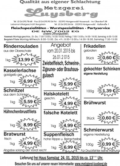 Deprecated: Die Funktion WP_Dependencies->add_data() wurde mit einem Argument aufgerufen, das seit Version 6.9.0 veraltet ist! Conditional Comments für den Internet Explorer werden von allen unterstützten Browsern ignoriert. in /var/www/vhosts/metzgerei-luysberg.de/httpdocs/wp-includes/functions.php on line 6131 Angebot vom 20.01.-26.01.15 – Metzgerei LuysbergZum Inhalt springen