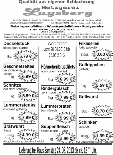 Deprecated: Die Funktion WP_Dependencies->add_data() wurde mit einem Argument aufgerufen, das seit Version 6.9.0 veraltet ist! Conditional Comments für den Internet Explorer werden von allen unterstützten Browsern ignoriert. in /var/www/vhosts/metzgerei-luysberg.de/httpdocs/wp-includes/functions.php on line 6131 Angebot vom 20.08-26.08.13 – Metzgerei LuysbergZum Inhalt springen