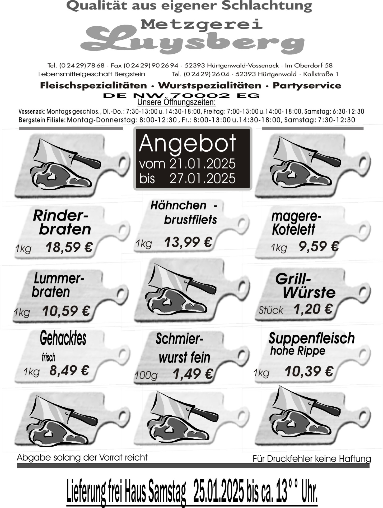 Deprecated: Die Funktion WP_Dependencies->add_data() wurde mit einem Argument aufgerufen, das seit Version 6.9.0 veraltet ist! Conditional Comments für den Internet Explorer werden von allen unterstützten Browsern ignoriert. in /var/www/vhosts/metzgerei-luysberg.de/httpdocs/wp-includes/functions.php on line 6131 Angebot vom 21.01.-27.01.2025 – Metzgerei LuysbergZum Inhalt springen