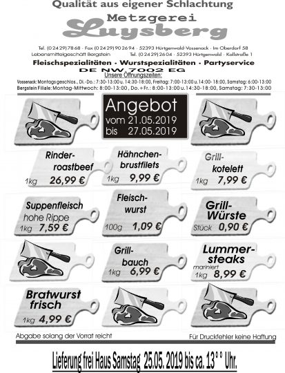 Deprecated: Die Funktion WP_Dependencies->add_data() wurde mit einem Argument aufgerufen, das seit Version 6.9.0 veraltet ist! Conditional Comments für den Internet Explorer werden von allen unterstützten Browsern ignoriert. in /var/www/vhosts/metzgerei-luysberg.de/httpdocs/wp-includes/functions.php on line 6131 Angebot vom 21.05.-27.05.19 – Metzgerei LuysbergZum Inhalt springen