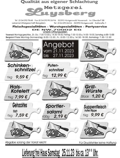 Deprecated: Die Funktion WP_Dependencies->add_data() wurde mit einem Argument aufgerufen, das seit Version 6.9.0 veraltet ist! Conditional Comments für den Internet Explorer werden von allen unterstützten Browsern ignoriert. in /var/www/vhosts/metzgerei-luysberg.de/httpdocs/wp-includes/functions.php on line 6131 Angebot vom 21.11.-27.11.2023 – Metzgerei LuysbergZum Inhalt springen