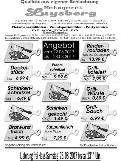 Deprecated: Die Funktion WP_Dependencies->add_data() wurde mit einem Argument aufgerufen, das seit Version 6.9.0 veraltet ist! Conditional Comments für den Internet Explorer werden von allen unterstützten Browsern ignoriert. in /var/www/vhosts/metzgerei-luysberg.de/httpdocs/wp-includes/functions.php on line 6131 Angebot vom 22.08.-28.08.17 – Metzgerei LuysbergZum Inhalt springen