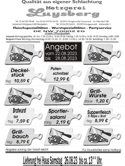 Deprecated: Die Funktion WP_Dependencies->add_data() wurde mit einem Argument aufgerufen, das seit Version 6.9.0 veraltet ist! Conditional Comments für den Internet Explorer werden von allen unterstützten Browsern ignoriert. in /var/www/vhosts/metzgerei-luysberg.de/httpdocs/wp-includes/functions.php on line 6131 Angebot vom 22.08.-28.08.2023 – Metzgerei LuysbergZum Inhalt springen