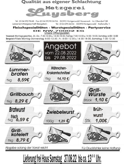 Deprecated: Die Funktion WP_Dependencies->add_data() wurde mit einem Argument aufgerufen, das seit Version 6.9.0 veraltet ist! Conditional Comments für den Internet Explorer werden von allen unterstützten Browsern ignoriert. in /var/www/vhosts/metzgerei-luysberg.de/httpdocs/wp-includes/functions.php on line 6131 Angebot vom 22.08.-29.08.22 – Metzgerei LuysbergZum Inhalt springen