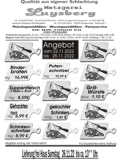 Deprecated: Die Funktion WP_Dependencies->add_data() wurde mit einem Argument aufgerufen, das seit Version 6.9.0 veraltet ist! Conditional Comments für den Internet Explorer werden von allen unterstützten Browsern ignoriert. in /var/www/vhosts/metzgerei-luysberg.de/httpdocs/wp-includes/functions.php on line 6131 Angebot vom 22.11.-28.11.2022 – Metzgerei LuysbergZum Inhalt springen