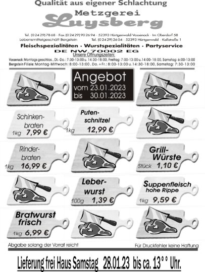 Deprecated: Die Funktion WP_Dependencies->add_data() wurde mit einem Argument aufgerufen, das seit Version 6.9.0 veraltet ist! Conditional Comments für den Internet Explorer werden von allen unterstützten Browsern ignoriert. in /var/www/vhosts/metzgerei-luysberg.de/httpdocs/wp-includes/functions.php on line 6131 Angebot vom 23.01.-30.01.23 – Metzgerei LuysbergZum Inhalt springen