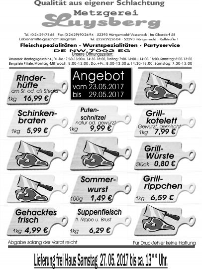 Deprecated: Die Funktion WP_Dependencies->add_data() wurde mit einem Argument aufgerufen, das seit Version 6.9.0 veraltet ist! Conditional Comments für den Internet Explorer werden von allen unterstützten Browsern ignoriert. in /var/www/vhosts/metzgerei-luysberg.de/httpdocs/wp-includes/functions.php on line 6131 Angebot vom 23.05.-29.05.17 – Metzgerei LuysbergZum Inhalt springen
