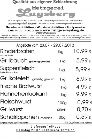 Deprecated: Die Funktion WP_Dependencies->add_data() wurde mit einem Argument aufgerufen, das seit Version 6.9.0 veraltet ist! Conditional Comments für den Internet Explorer werden von allen unterstützten Browsern ignoriert. in /var/www/vhosts/metzgerei-luysberg.de/httpdocs/wp-includes/functions.php on line 6131 Angebot vom 23.07-29.07.13 – Metzgerei LuysbergZum Inhalt springen
