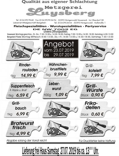 Deprecated: Die Funktion WP_Dependencies->add_data() wurde mit einem Argument aufgerufen, das seit Version 6.9.0 veraltet ist! Conditional Comments für den Internet Explorer werden von allen unterstützten Browsern ignoriert. in /var/www/vhosts/metzgerei-luysberg.de/httpdocs/wp-includes/functions.php on line 6131 Angebot vom 23.07-29.07.19 – Metzgerei LuysbergZum Inhalt springen