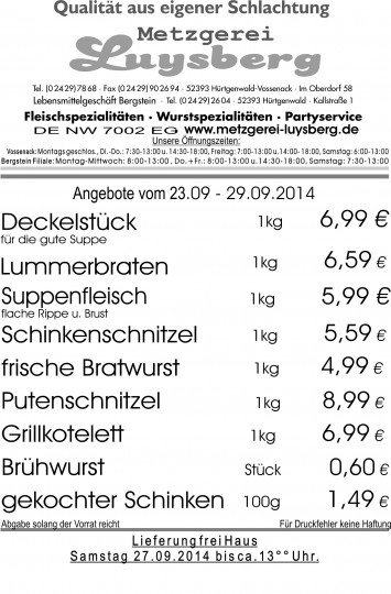 Angebot vom 23.09.-29.09.14 – Metzgerei Luysberg