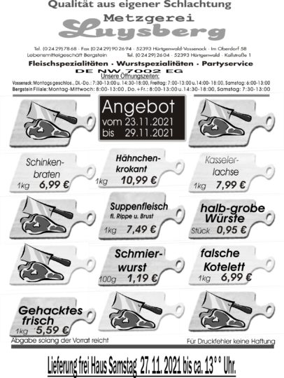 Deprecated: Die Funktion WP_Dependencies->add_data() wurde mit einem Argument aufgerufen, das seit Version 6.9.0 veraltet ist! Conditional Comments für den Internet Explorer werden von allen unterstützten Browsern ignoriert. in /var/www/vhosts/metzgerei-luysberg.de/httpdocs/wp-includes/functions.php on line 6131 Angebot vom 23.11.-29.11.21 – Metzgerei LuysbergZum Inhalt springen