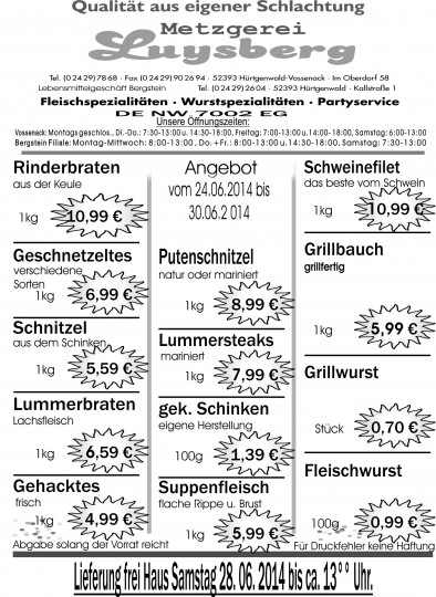 Deprecated: Die Funktion WP_Dependencies->add_data() wurde mit einem Argument aufgerufen, das seit Version 6.9.0 veraltet ist! Conditional Comments für den Internet Explorer werden von allen unterstützten Browsern ignoriert. in /var/www/vhosts/metzgerei-luysberg.de/httpdocs/wp-includes/functions.php on line 6131 Angebot vom 24.06-30.06.14 – Metzgerei LuysbergZum Inhalt springen