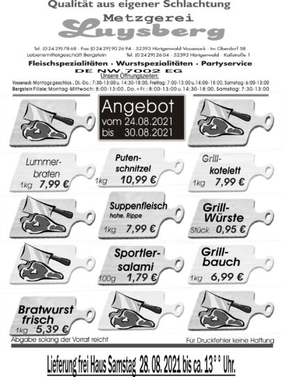 Deprecated: Die Funktion WP_Dependencies->add_data() wurde mit einem Argument aufgerufen, das seit Version 6.9.0 veraltet ist! Conditional Comments für den Internet Explorer werden von allen unterstützten Browsern ignoriert. in /var/www/vhosts/metzgerei-luysberg.de/httpdocs/wp-includes/functions.php on line 6131 Angebot vom 24.08.-30.08.21 – Metzgerei LuysbergZum Inhalt springen