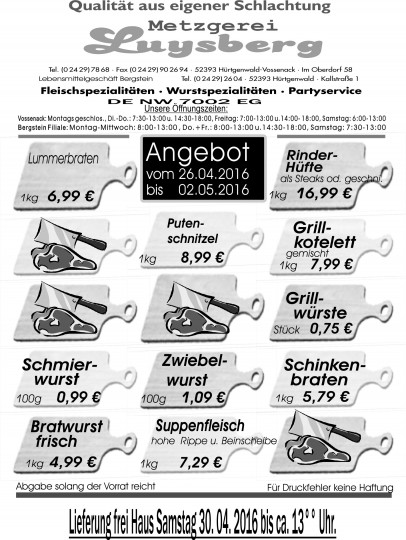 Deprecated: Die Funktion WP_Dependencies->add_data() wurde mit einem Argument aufgerufen, das seit Version 6.9.0 veraltet ist! Conditional Comments für den Internet Explorer werden von allen unterstützten Browsern ignoriert. in /var/www/vhosts/metzgerei-luysberg.de/httpdocs/wp-includes/functions.php on line 6131 Angebot vom 26.04.-02.05.16 – Metzgerei LuysbergZum Inhalt springen