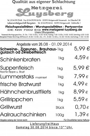 Angebot vom 26.08.-01.09.14 – Metzgerei Luysberg