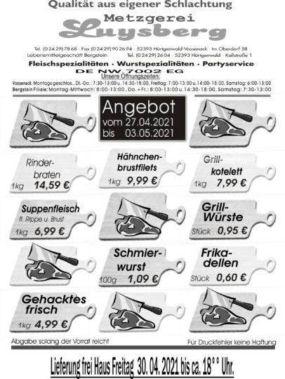 Deprecated: Die Funktion WP_Dependencies->add_data() wurde mit einem Argument aufgerufen, das seit Version 6.9.0 veraltet ist! Conditional Comments für den Internet Explorer werden von allen unterstützten Browsern ignoriert. in /var/www/vhosts/metzgerei-luysberg.de/httpdocs/wp-includes/functions.php on line 6131 Angebot vom 27.04.-03.05.21 – Metzgerei LuysbergZum Inhalt springen
