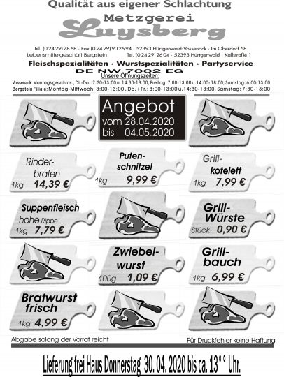 Angebot vom 28.04.-04.05.20 – Metzgerei Luysberg