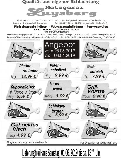 Deprecated: Die Funktion WP_Dependencies->add_data() wurde mit einem Argument aufgerufen, das seit Version 6.9.0 veraltet ist! Conditional Comments für den Internet Explorer werden von allen unterstützten Browsern ignoriert. in /var/www/vhosts/metzgerei-luysberg.de/httpdocs/wp-includes/functions.php on line 6131 Angebot vom 28.05.-03.06.19 – Metzgerei LuysbergZum Inhalt springen