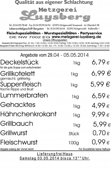 Deprecated: Die Funktion WP_Dependencies->add_data() wurde mit einem Argument aufgerufen, das seit Version 6.9.0 veraltet ist! Conditional Comments für den Internet Explorer werden von allen unterstützten Browsern ignoriert. in /var/www/vhosts/metzgerei-luysberg.de/httpdocs/wp-includes/functions.php on line 6131 Angebot vom 29.04.-05.05.2014 – Metzgerei LuysbergZum Inhalt springen