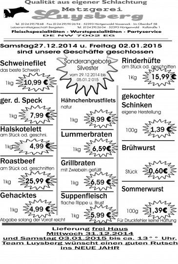 Deprecated: Die Funktion WP_Dependencies->add_data() wurde mit einem Argument aufgerufen, das seit Version 6.9.0 veraltet ist! Conditional Comments für den Internet Explorer werden von allen unterstützten Browsern ignoriert. in /var/www/vhosts/metzgerei-luysberg.de/httpdocs/wp-includes/functions.php on line 6131 Angebot vom 29.12.14-05.01.15 – Metzgerei LuysbergZum Inhalt springen