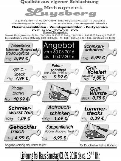 Deprecated: Die Funktion WP_Dependencies->add_data() wurde mit einem Argument aufgerufen, das seit Version 6.9.0 veraltet ist! Conditional Comments für den Internet Explorer werden von allen unterstützten Browsern ignoriert. in /var/www/vhosts/metzgerei-luysberg.de/httpdocs/wp-includes/functions.php on line 6131 Angebot vom 30.08.-05.09.16 – Metzgerei LuysbergZum Inhalt springen