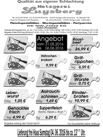 Deprecated: Die Funktion WP_Dependencies->add_data() wurde mit einem Argument aufgerufen, das seit Version 6.9.0 veraltet ist! Conditional Comments für den Internet Explorer werden von allen unterstützten Browsern ignoriert. in /var/www/vhosts/metzgerei-luysberg.de/httpdocs/wp-includes/functions.php on line 6131 Angebot vom 31.05.-06.06.16 – Metzgerei LuysbergZum Inhalt springen