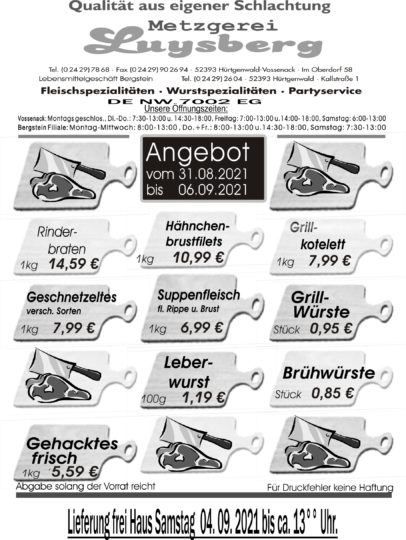 Deprecated: Die Funktion WP_Dependencies->add_data() wurde mit einem Argument aufgerufen, das seit Version 6.9.0 veraltet ist! Conditional Comments für den Internet Explorer werden von allen unterstützten Browsern ignoriert. in /var/www/vhosts/metzgerei-luysberg.de/httpdocs/wp-includes/functions.php on line 6131 Angebot vom 31.08.-06.09.21 – Metzgerei LuysbergZum Inhalt springen