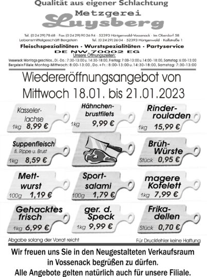 Deprecated: Die Funktion WP_Dependencies->add_data() wurde mit einem Argument aufgerufen, das seit Version 6.9.0 veraltet ist! Conditional Comments für den Internet Explorer werden von allen unterstützten Browsern ignoriert. in /var/www/vhosts/metzgerei-luysberg.de/httpdocs/wp-includes/functions.php on line 6131 Angebot zur Wiedereröffnung vom 18.01.-21.01.23 – Metzgerei LuysbergZum Inhalt springen