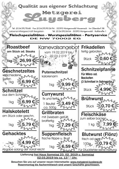 Deprecated: Die Funktion WP_Dependencies->add_data() wurde mit einem Argument aufgerufen, das seit Version 6.9.0 veraltet ist! Conditional Comments für den Internet Explorer werden von allen unterstützten Browsern ignoriert. in /var/www/vhosts/metzgerei-luysberg.de/httpdocs/wp-includes/functions.php on line 6131 AQngebot vom 19.02.-02.03.19 – Metzgerei LuysbergZum Inhalt springen