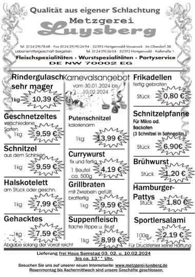 Deprecated: Die Funktion WP_Dependencies->add_data() wurde mit einem Argument aufgerufen, das seit Version 6.9.0 veraltet ist! Conditional Comments für den Internet Explorer werden von allen unterstützten Browsern ignoriert. in /var/www/vhosts/metzgerei-luysberg.de/httpdocs/wp-includes/functions.php on line 6131 Karnevalsangebot vom 30.01.-10.02.24 – Metzgerei LuysbergZum Inhalt springen