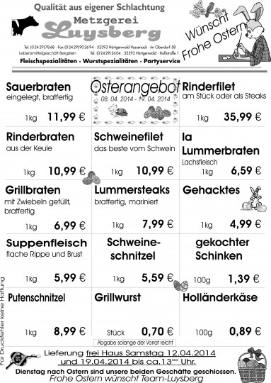 Deprecated: Die Funktion WP_Dependencies->add_data() wurde mit einem Argument aufgerufen, das seit Version 6.9.0 veraltet ist! Conditional Comments für den Internet Explorer werden von allen unterstützten Browsern ignoriert. in /var/www/vhosts/metzgerei-luysberg.de/httpdocs/wp-includes/functions.php on line 6131 Osterangebot 08-04-19.04.14 – Metzgerei LuysbergZum Inhalt springen