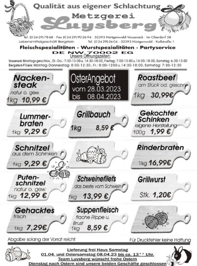 Deprecated: Die Funktion WP_Dependencies->add_data() wurde mit einem Argument aufgerufen, das seit Version 6.9.0 veraltet ist! Conditional Comments für den Internet Explorer werden von allen unterstützten Browsern ignoriert. in /var/www/vhosts/metzgerei-luysberg.de/httpdocs/wp-includes/functions.php on line 6131 Osterangebot 28.03. bis 08.04.23 – Metzgerei LuysbergZum Inhalt springen