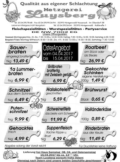 Deprecated: Die Funktion WP_Dependencies->add_data() wurde mit einem Argument aufgerufen, das seit Version 6.9.0 veraltet ist! Conditional Comments für den Internet Explorer werden von allen unterstützten Browsern ignoriert. in /var/www/vhosts/metzgerei-luysberg.de/httpdocs/wp-includes/functions.php on line 6131 Osterangebot vom 04.04.-15.04.2017 – Metzgerei LuysbergZum Inhalt springen