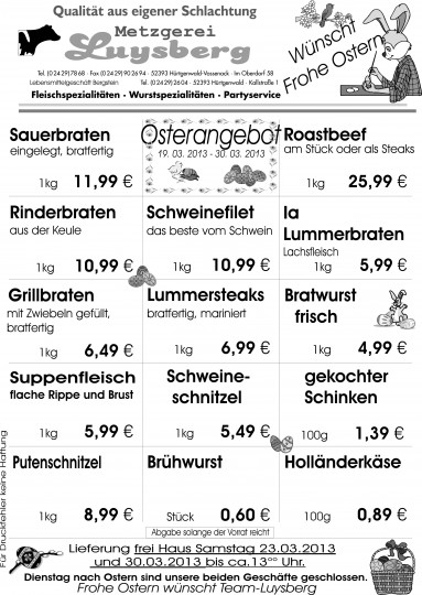 Deprecated: Die Funktion WP_Dependencies->add_data() wurde mit einem Argument aufgerufen, das seit Version 6.9.0 veraltet ist! Conditional Comments für den Internet Explorer werden von allen unterstützten Browsern ignoriert. in /var/www/vhosts/metzgerei-luysberg.de/httpdocs/wp-includes/functions.php on line 6131 Osterangebot 19.03-30.03.2013 – Metzgerei LuysbergZum Inhalt springen
