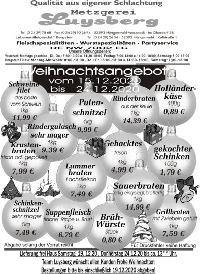 Deprecated: Die Funktion WP_Dependencies->add_data() wurde mit einem Argument aufgerufen, das seit Version 6.9.0 veraltet ist! Conditional Comments für den Internet Explorer werden von allen unterstützten Browsern ignoriert. in /var/www/vhosts/metzgerei-luysberg.de/httpdocs/wp-includes/functions.php on line 6131 Weihnachtsangebot 15.12.-24.12.2020 – Metzgerei LuysbergZum Inhalt springen